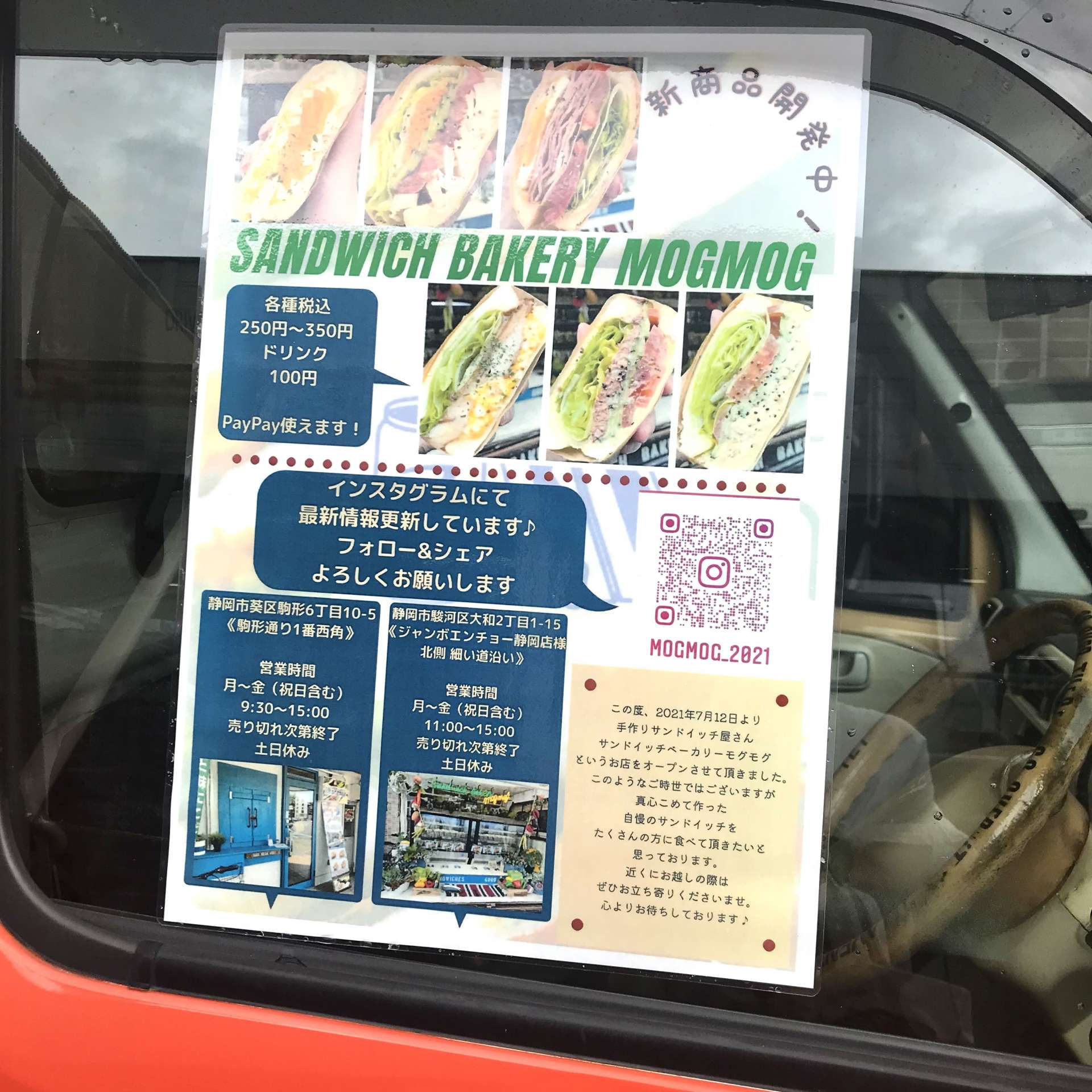ジャンボエンチョー静岡店の裏通りに可愛いミニバンでサンドイッチを販売されている「MOG MOG」さん。シャキシャキレタスとトマト・ベーコンのおなじみBLTや、そこに卵が入ったBLETなど250円~350円くらいのお手軽なお値段のサンドイッチが並んでおります!