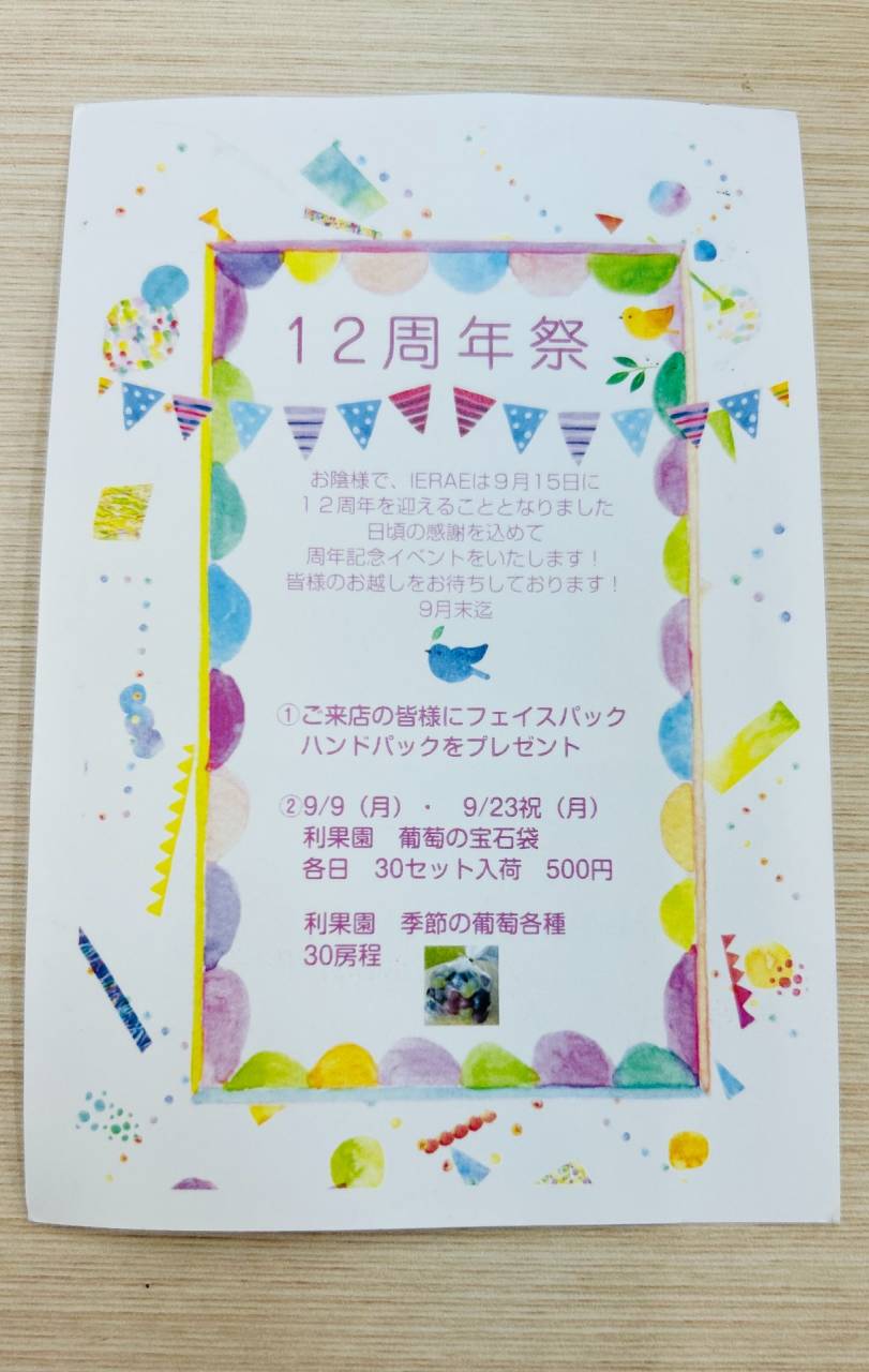 周年記念 2024/09/03 お陰様で12周年を迎えさせていただきます。 皆様に心より感謝申し上げます。 今後ともどうぞよろしくお願いいたします。 ご来店の皆様に、フェイスパック・ハンドパックをプレゼントしております! 数量限定となります!